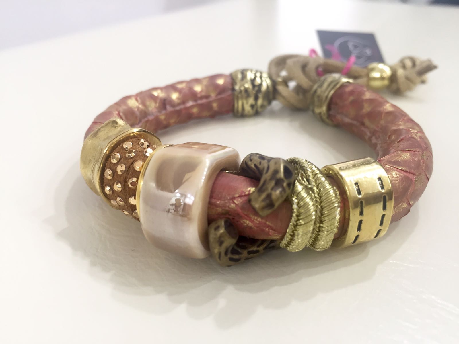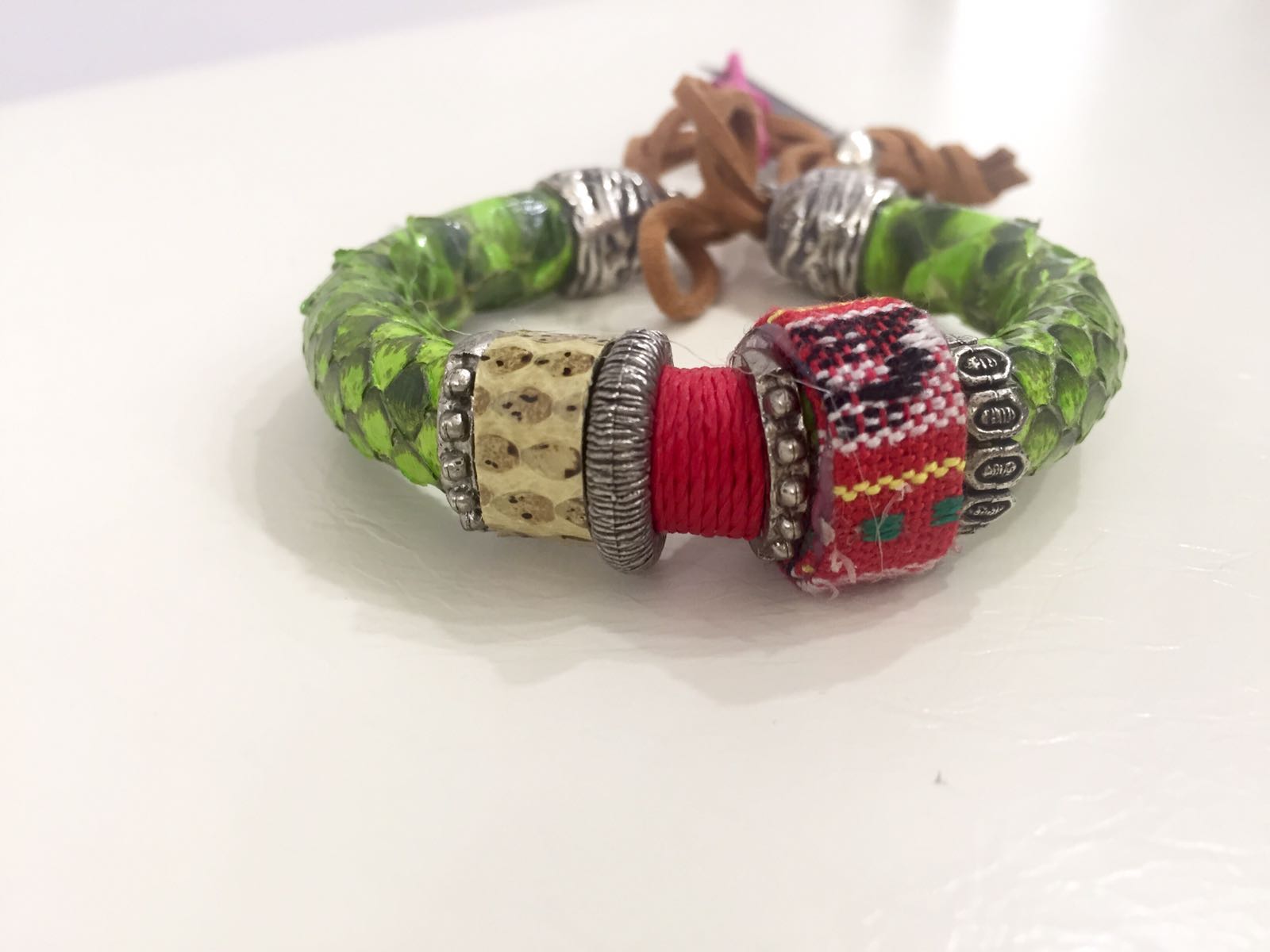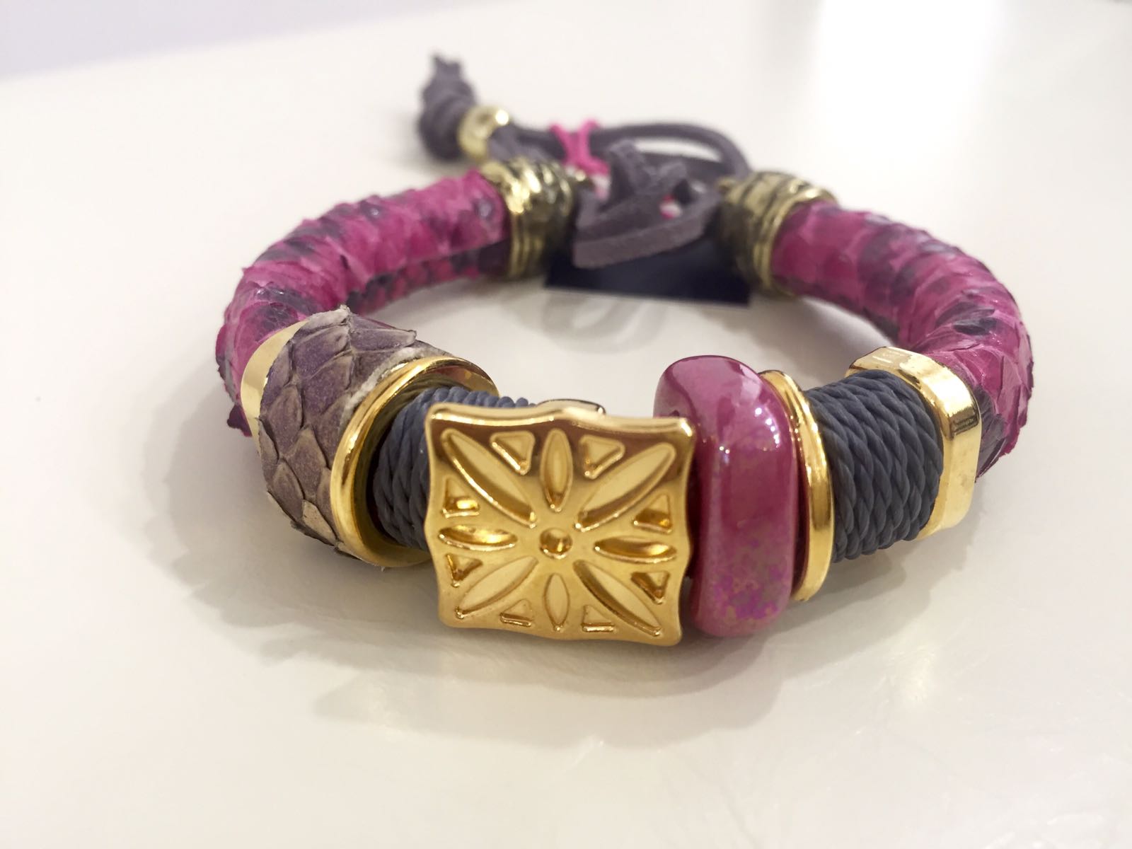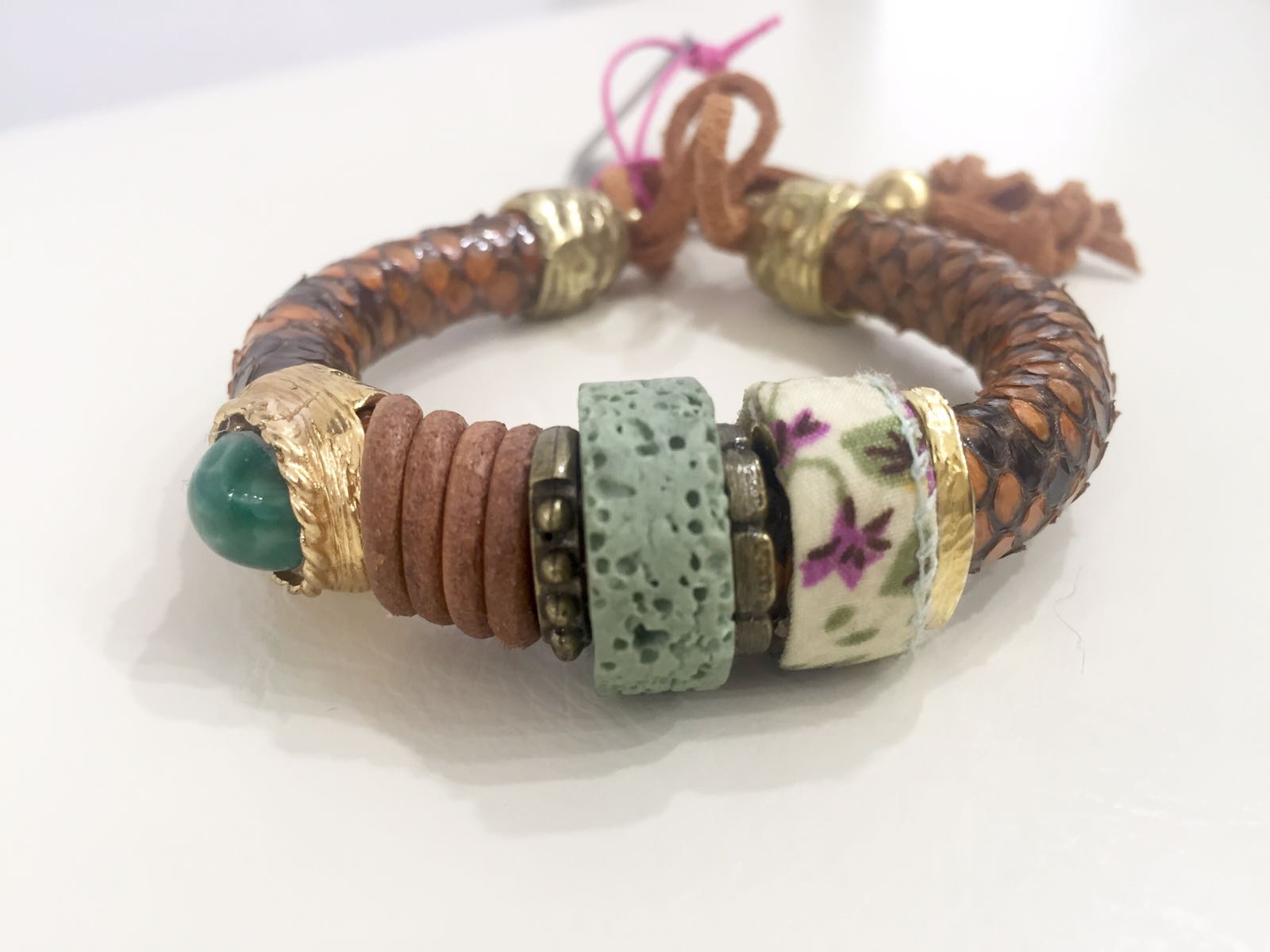 Pulseras en piel de pitón, con detalles como piezas en zamak bañadas en oro y plata, piedras exóticas, cerámicas coloreadas, hilos encerados y suaves tejidos de seda…