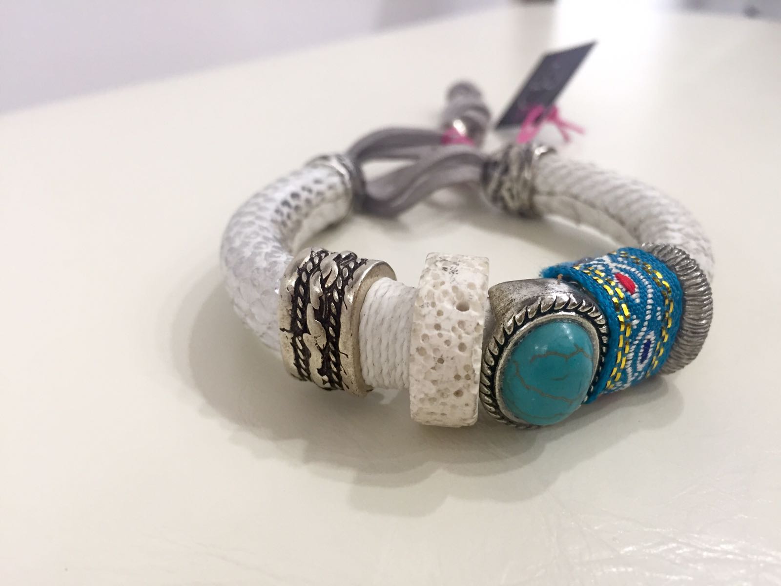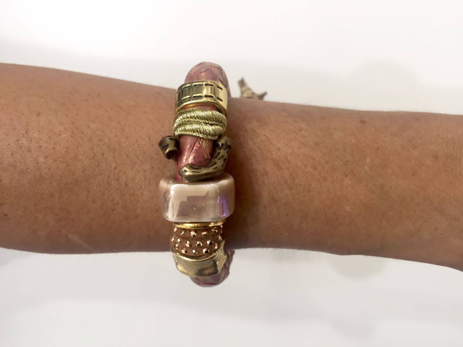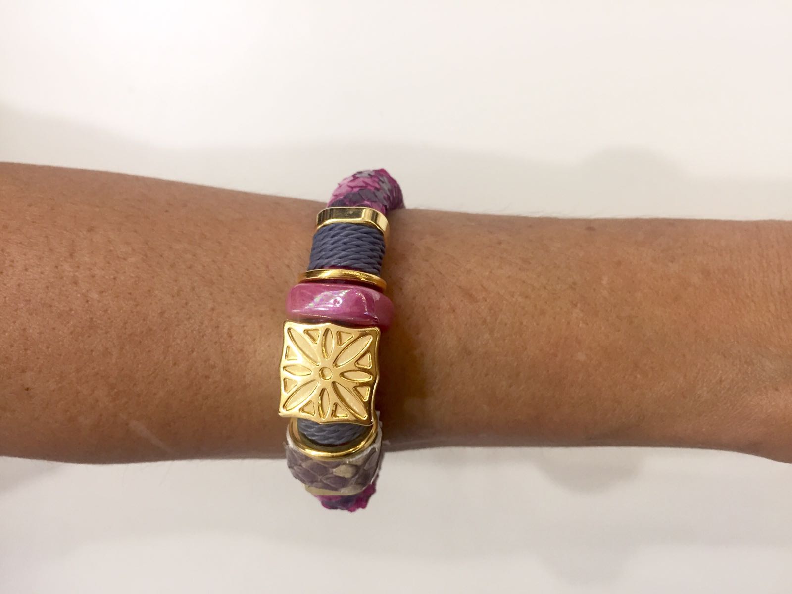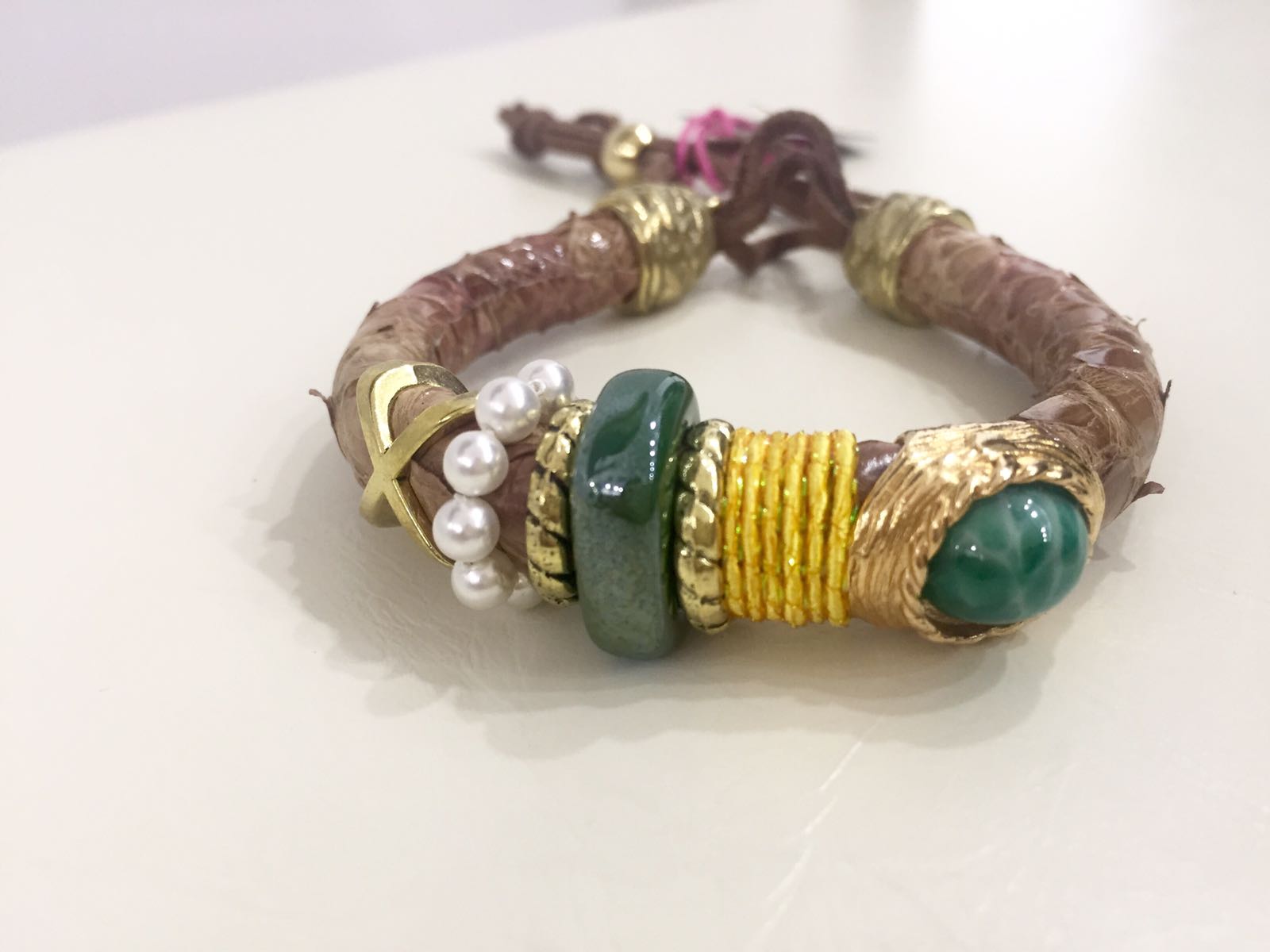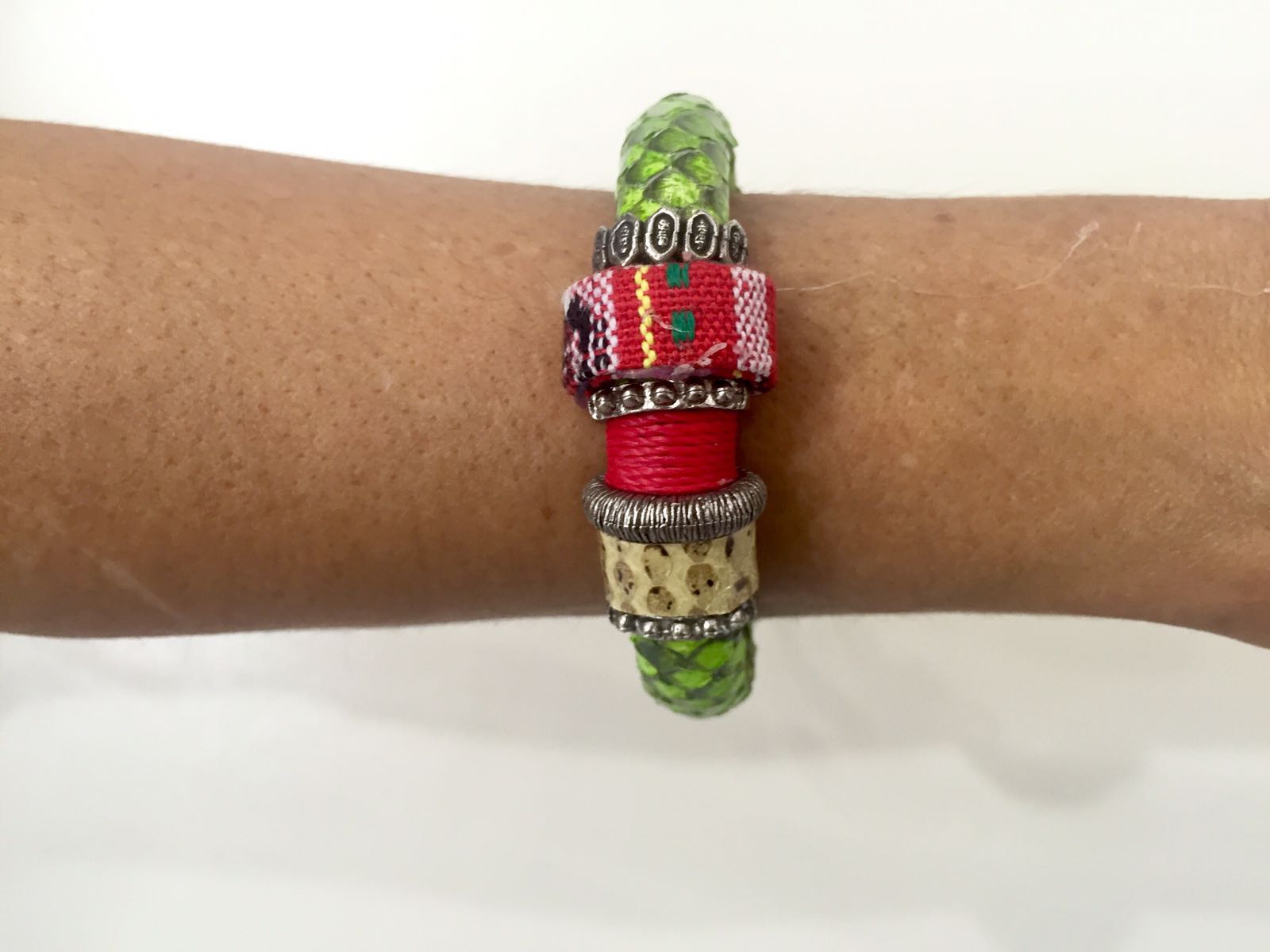 Pulseras en piel de pitón, con detalles como piezas en zamak bañadas en oro y plata, piedras exóticas, cerámicas coloreadas, hilos encerados y suaves tejidos de seda…